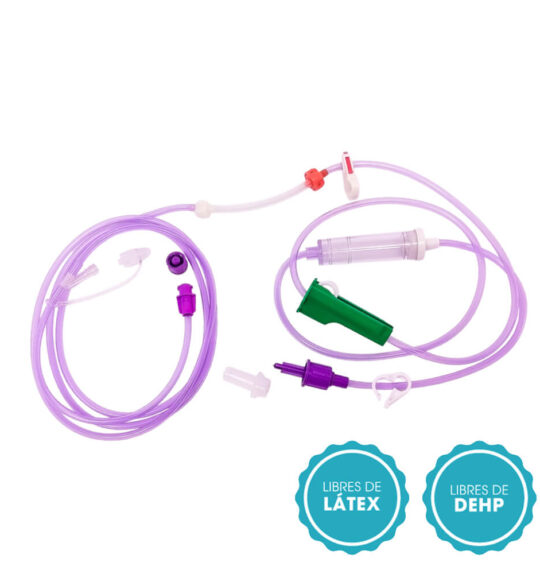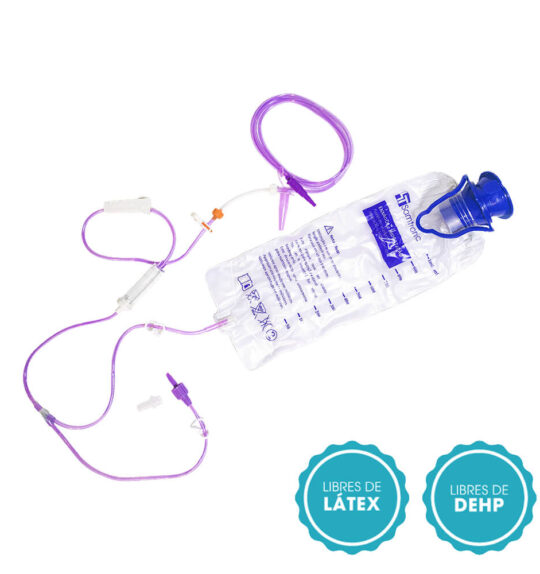Bomba y descartables en color lila, conforme a normas internacionales, que facilitan la correcta identificación de infusiones enterales y minimizan riesgos de conexión cruzada.